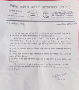 जिला कांग्रेस कमेटी ने मांग की कि अबूझमाड़ एवं जिला मुख्यालय नारायणपुर की प्रवेश द्वार सड़क का तत्काल सुधार एवं स्थायी समाधान किया जाए, ताकि आम जनता को राहत मिल सके। इसके सिवा गढबेंगाल चौक से कोंडागांव और  छोटडोगर तक ग्रामीण क्षेत्र मे पानी का छिड़काव किया जाये ताकि इस मार्ग मे चलने वाले यात्री को धुल से थोड़ा राहत मिल सके!